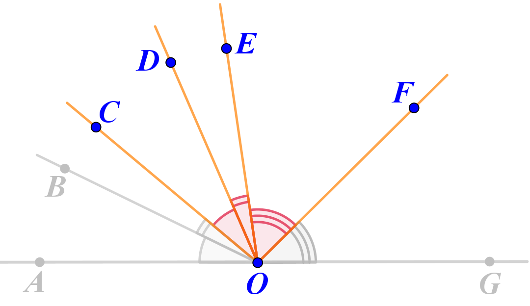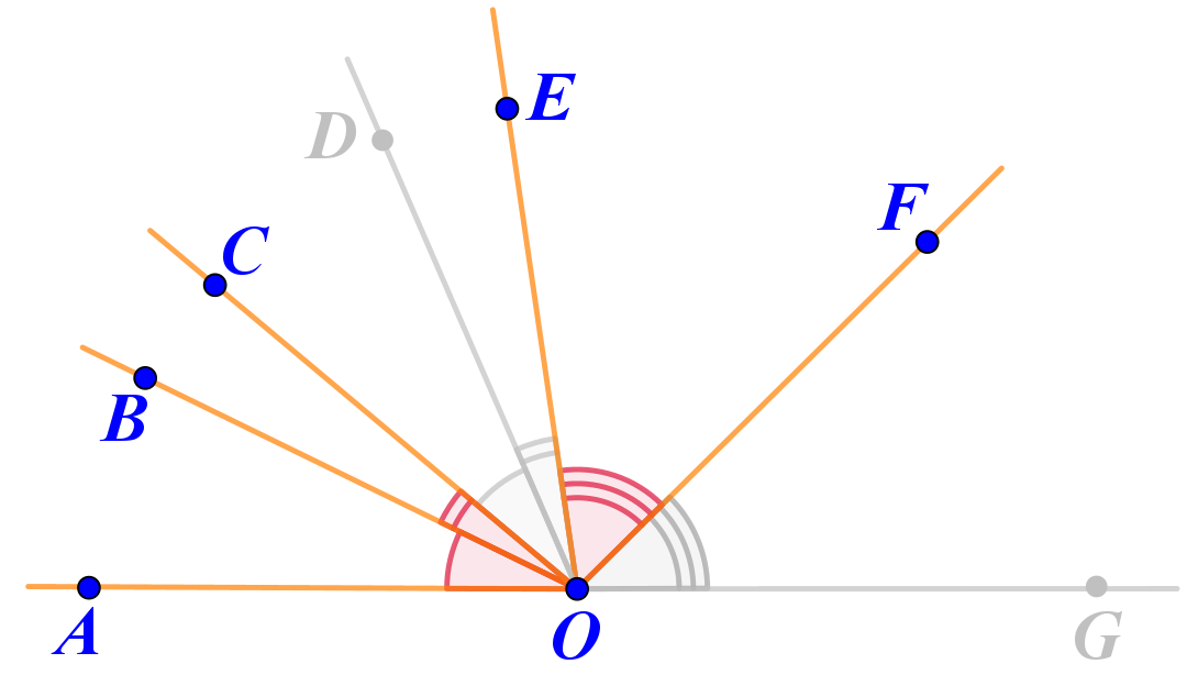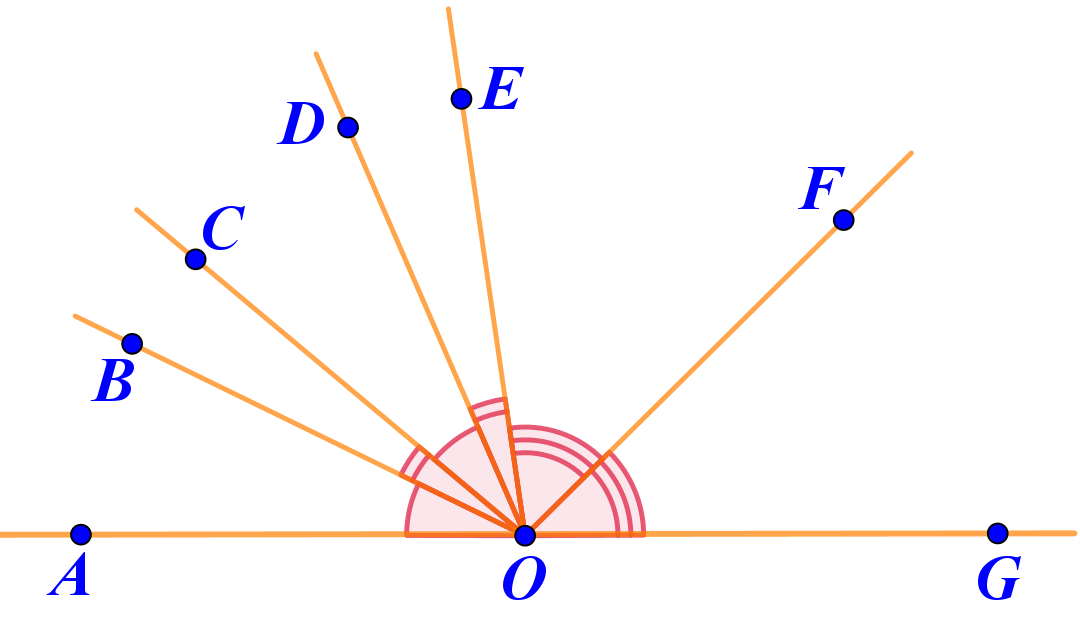 Развёрнутый угол \(\displaystyle AOG\) разделён на шесть острых углов.