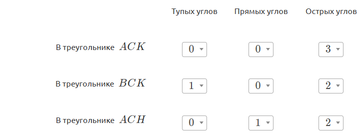 - Угол \(\displaystyle AKC\) является углом прямоугольного треугольника \(\displaystyle KCH\) с прямым углом \(\displaystyle CHK{\small .}\) Значит, он острый по свойству прямоугольного треугольника.