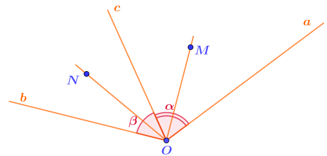 Три луча \(\displaystyle a{\small ,\;}b\) и \(\displaystyle c\) с общим началом \(\displaystyle O\) образуют углы величинами \(\displaystyle \alpha=74\degree \) и \(\displaystyle \beta=48\degree {\small .}\)