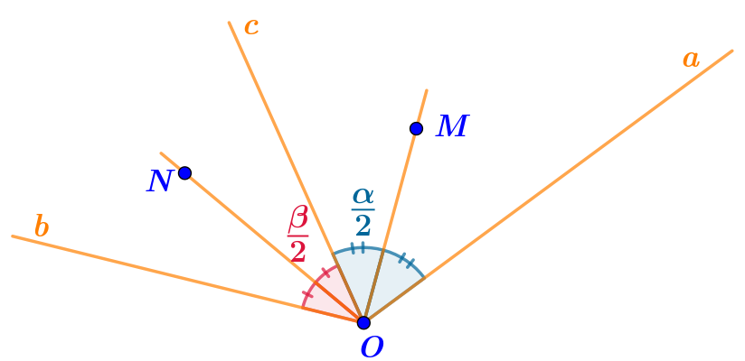 - величина угла, образованного лучами \(\displaystyle ON\) и \(\displaystyle c{\small ,}\) равна половине величины угла \(\displaystyle bc{\small ,}\) то есть \(\displaystyle \frac{\beta}{2}{\small .}\)