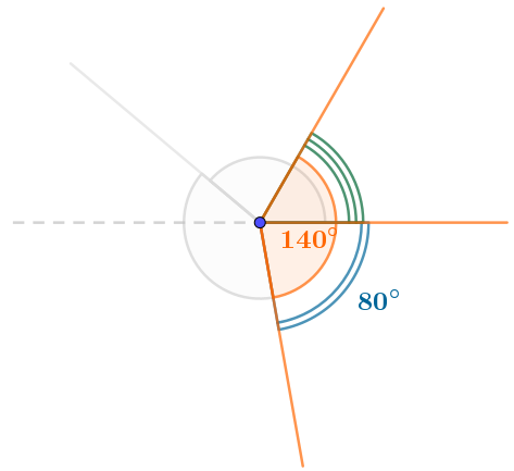Тогда искомый угол становится частью угла угла величиной \(\displaystyle 140\degree {\small ,}\) при том, что величина другой части равна \(\displaystyle 80\degree {\small .}\)