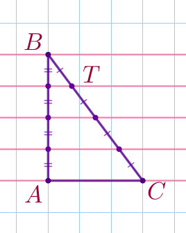 Эти прямые делят катет \(\displaystyle AB\) на четыре равных отрезка, каждый из которых равен стороне клетки.