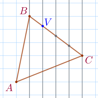 На клетчатой бумаге изображён треугольник \(\displaystyle ABC{\small,}\) на стороне \(\displaystyle BC\) которого отмечена точка \(\displaystyle V{\small.}\) Найдите отношение \(\displaystyle BV:VC{\small.}\)