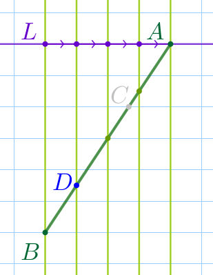 Согласно теореме Фалеса построенные горизонтальные прямые делят отрезок \(\displaystyle AB\) на четыре равных между собой отрезка.