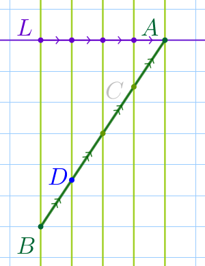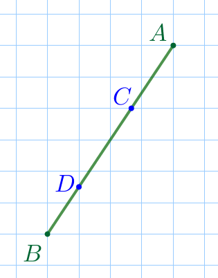 На клетчатой бумаге изображён отрезок \(\displaystyle AB{\small,}\) на котором отмечены точки \(\displaystyle C\) и \(\displaystyle D{\small.}\)