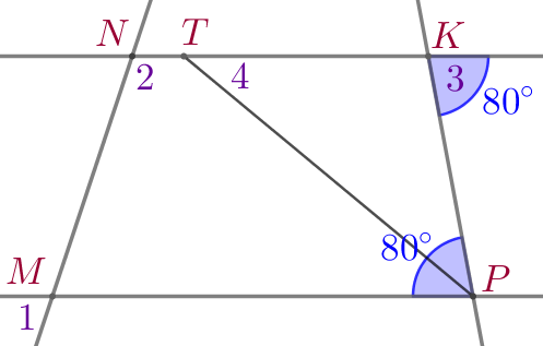 ![]() | \(\displaystyle \angle MPK\) и \(\displaystyle \angle 3\) – накрест лежащие углы при параллельных прямых \(\displaystyle MP\) и \(\displaystyle NK\) и секущей \(\displaystyle KP{\small,}\) значит, \(\displaystyle \angle MPK=\angle 3=80^{\circ}{\small.}\) |
