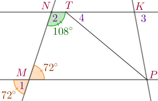 \(\displaystyle \angle NMP + \angle 2=72^{\circ}+108^{\circ}=180^{\circ}{\small,}\) то \(\displaystyle MP \parallel NK{\small.}\) |