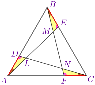 Следовательно, \(\displaystyle \triangle ADL=\triangle BEM=\triangle CFN\) по стороне и двум прилежащим к ней углам. |