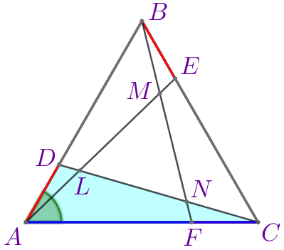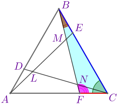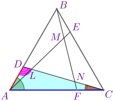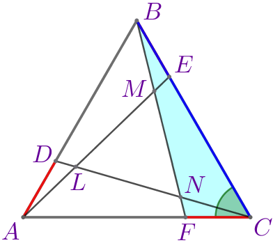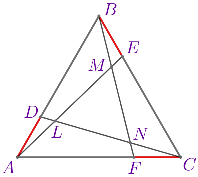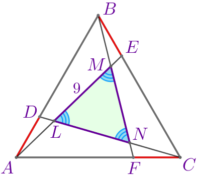 На сторонах \(\displaystyle AB{\small,}\) \(\displaystyle BC\) и \(\displaystyle AC\) равностороннего треугольника \(\displaystyle ABC\) отметили соответственно точки \(\displaystyle D{\small,}\) \(\displaystyle E\) и \(\displaystyle F\) так, что \(\displaystyle AD=BE=CF{\small.}\) \(\displaystyle L\) – точка пересечения отрезков \(\displaystyle AE\) и \(\displaystyle CD{\small,}\) \(\displaystyle M\) – точка пересечения отрезков \(\displaystyle AE\) и \(\displaystyle BF{\small,}\) \(\displaystyle N\) – точка пересечения отрезков \(\displaystyle BF\) и \(\displaystyle CD{\small.}\) Найдите \(\displaystyle MN\) и \(\displaystyle LN{\small,}\) если \(\displaystyle ML=9{\small.}\)