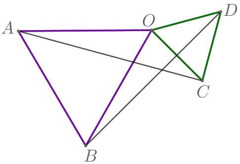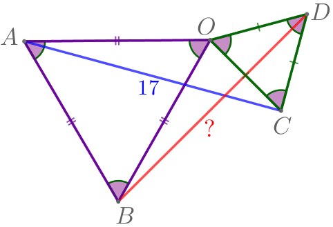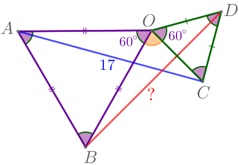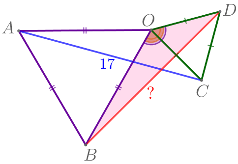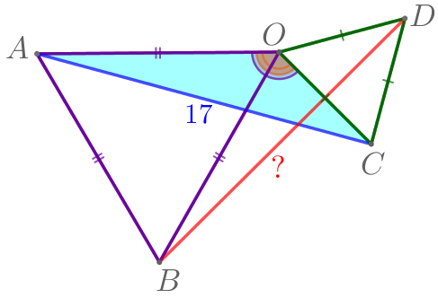 Два неравных равносторонних треугольника \(\displaystyle AOB\) и \(\displaystyle COD\) имеют общую вершину \(\displaystyle O{\small.}\) Найдите длину отрезка \(\displaystyle BD{\small,}\) если \(\displaystyle AC=17{\small.}\)