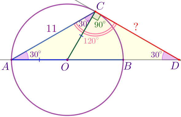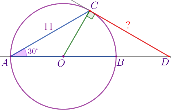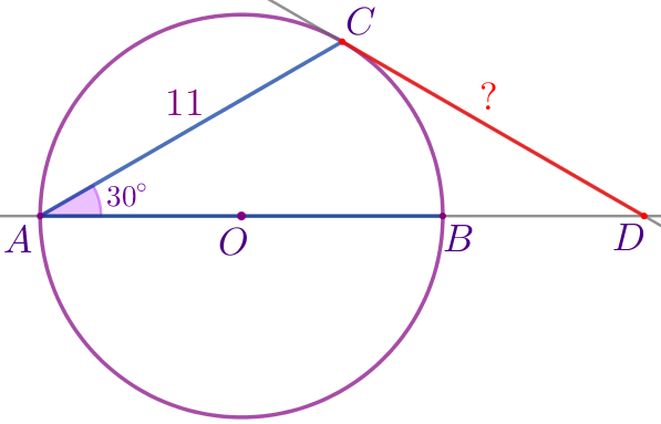Угол между диаметром \(\displaystyle AB\) и хордой \(\displaystyle AC\) равен \(\displaystyle 30^{\circ}{\small.}\) Через точку \(\displaystyle C\) проведена касательная, пересекающая прямую \(\displaystyle AB\) в точке \(\displaystyle D{\small.}\) Найдите длину отрезка \(\displaystyle CD{\small,}\) если \(\displaystyle AC=11{\small.}\)
