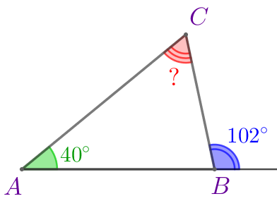 В треугольнике \(\displaystyle ABC\) угол \(\displaystyle A\) равен \(\displaystyle 40^{\circ}{\small , }\) внешний угол при вершине \(\displaystyle B\) равен \(\displaystyle 102^{\circ}.\)