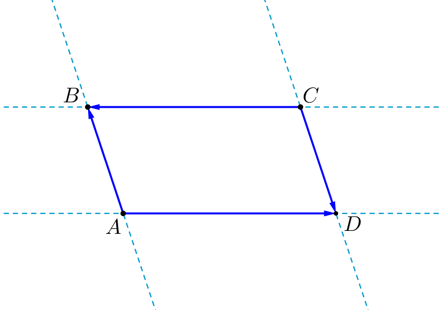 Векторы \(\displaystyle AB\) и \(\displaystyle CD\) коллинеарны. То есть они лежат на параллельных прямых. Векторы \(\displaystyle AD\) и \(\displaystyle CB\) тоже коллинеарны. То есть и прямые \(\displaystyle AD\) и \(\displaystyle CB\) параллельны. Тогда у четырехугольника \(\displaystyle ABCD\) противоположные стороны попарно параллельны. Это один из признаков параллелограмма. То есть \(\displaystyle ABCD\) – параллелограмм. | ![]() |