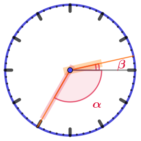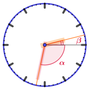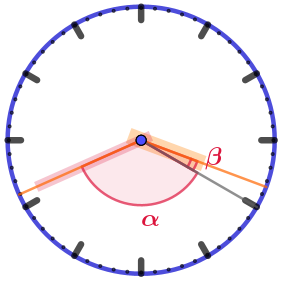 | \(\displaystyle 02:32\) | ![]() | Угол величиной \(\displaystyle \alpha\) заключает ровно \(\displaystyle 17\) делений минутной разметки. Значит, \(\displaystyle \alpha=17\cdot 6\degree =102\degree{\small .} \) До конца часа, когда часовая стрелка достигнет метки часовой разметки, она будет двигаться \(\displaystyle 28\) минут. Значит \(\displaystyle \beta=28\cdot 0{,}5\degree =14\degree {\small .}\) Искомый угол: \(\displaystyle \alpha+\beta=102\degree +14\degree =116\degree{\small .} \) |