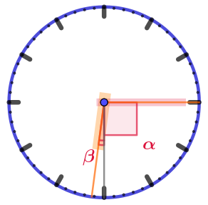 | \(\displaystyle 03:41\) | ![]() | Угол величиной \(\displaystyle \alpha\) заключает ровно \(\displaystyle 21\) деление минутной разметки. Значит, \(\displaystyle \alpha=21\cdot 6\degree =126\degree{\small .} \) До конца часа, когда часовая стрелка достигнет метки часовой разметки, она будет двигаться \(\displaystyle 19\) минут. Значит \(\displaystyle \beta=19\cdot 0{,}5\degree =9{,}5\degree {\small .}\) Искомый угол: \(\displaystyle \alpha+\beta=126\degree +9{,}5\degree =135{,}5\degree{\small .} \) |