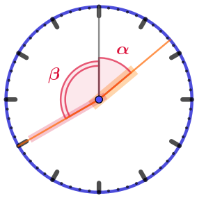 Угол между начальным и конечным направлениями минутной стрелки: \(\displaystyle \beta =\)\(\displaystyle \degree \)