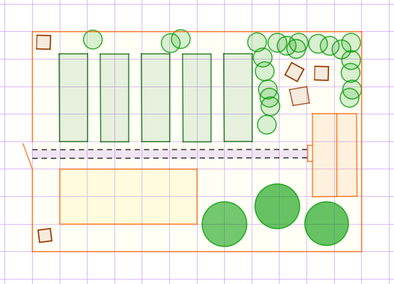 На участке расположена бытовка, к которой от калитки проложена дорожка. Если идти по ней от калитки, то слева окажутся несколько одинаковых грядок прямоугольной формы. Справа \(\displaystyle -\) парник, длина которого на \(\displaystyle 270\;{\footnotesize см}\) больше ширины, и три яблони. Рядом с бытовкой оборудовано пространство для отдыха под открытым небом, и высажены кусты смородины.