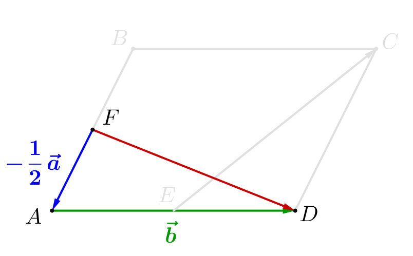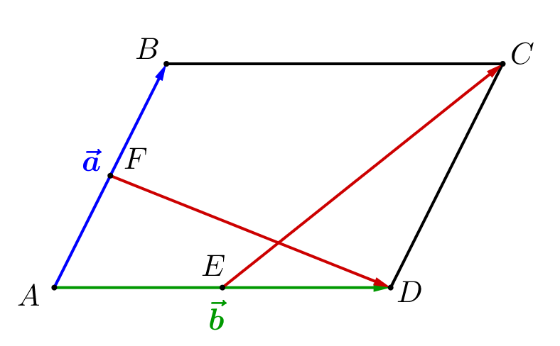 Обозначим векторы \(\displaystyle \overrightarrow{AB}=\vec{a}\) и \(\displaystyle \overrightarrow{AD}=\vec{b}\small.\) Выразите векторы \(\displaystyle \overrightarrow{FD}\) и \(\displaystyle \overrightarrow{EC}\) через \(\displaystyle \vec{a}\) и \(\displaystyle \vec{b}\small.\)