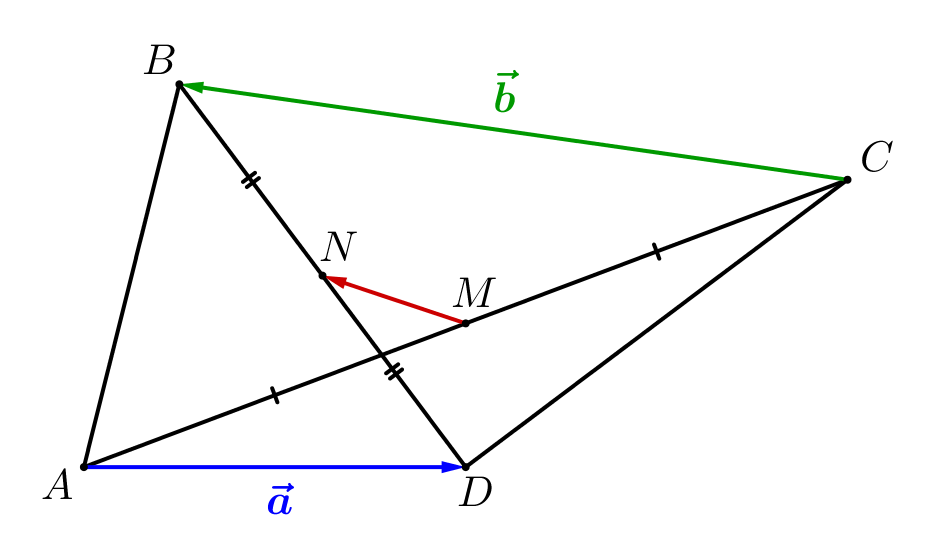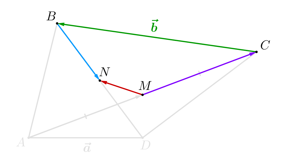 \(\displaystyle \overrightarrow{MN}=\overrightarrow{MC}+\vec{b}+\overrightarrow{BN}=\frac{1}{2}\left(\overrightarrow{AB}-\vec{b}\right)+\vec{b}+\frac{1}{2}\left(-\overrightarrow{AB}+\vec{a}\right)=\frac{1}{2}\vec{a}+\frac{1}{2}\vec{b}\small.\)