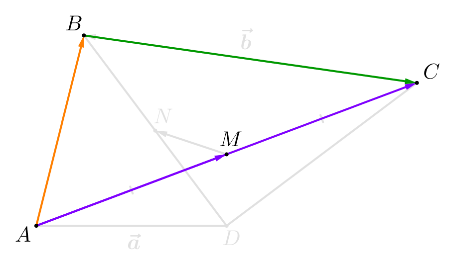 \(\displaystyle \overrightarrow{MC}=\frac{1}{2}\left(\overrightarrow{AB}+\overrightarrow{BC}\right)=\frac{1}{2}\left(\overrightarrow{AB}-\vec{b}\right)\small.\)