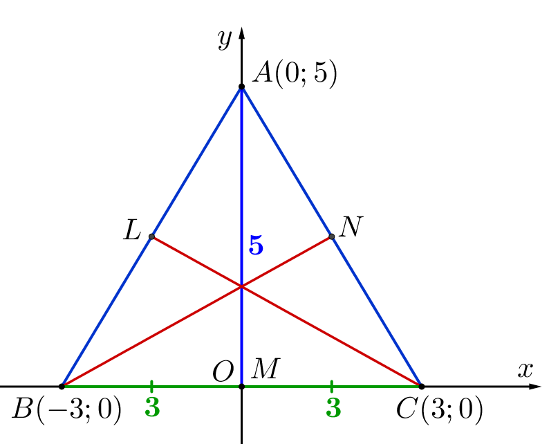 Медиана делит основание треугольника пополам, то есть \(\displaystyle BM=CM=\frac{BC}{2}=\frac{6}{2}=3\small.\) Значит, координаты точек: \(\displaystyle B(-3;\,0)\) и \(\displaystyle C(3;\,0)\small.\) По условию, треугольник равнобедренный, откуда\(\displaystyle AB=AC\small.\) Тогда медиана \(\displaystyle AM\) является и высотой. То есть точка \(\displaystyle A\) лежит на оси \(\displaystyle Oy\) и ее координата: \(\displaystyle A(0;\,5)\small.\) | ![]() |