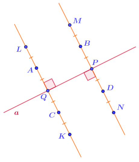 Через точки \(\displaystyle P\) и \(\displaystyle Q\) прямой \(\displaystyle a\) проведены две перпендикулярные ей прямые.