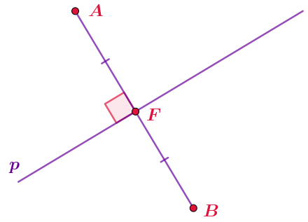На рисунке точки \(\displaystyle A\) и \(\displaystyle B\) симметричны относительно прямой \(\displaystyle p{\small .}\) Середина \(\displaystyle F\) отрезка \(\displaystyle AB\) симметрична сама себе относительно этой прямой.