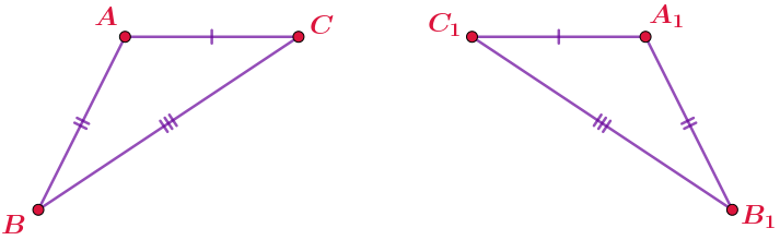 \(\displaystyle\left\{\begin{array}{}AC=A_1C_1\\AB=A_1B_1\\BC=B_1C_1\end{array} {\LARGE\Rightarrow} \quad {\bf\triangle}ABC={\bf\triangle}A_1B_1C_1\right.\)
