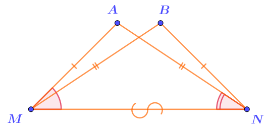 Выпишем равные элементы треугольников \(\displaystyle AMN\) и \(\displaystyle BNM{\small ,}\) дополнив обозначения рисунка их общей стороной \(\displaystyle MN{\text :}\)