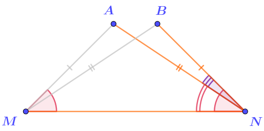 Расстояния от точки \(\displaystyle B\) до его вершин \(\displaystyle M\) и \(\displaystyle N\) соответственно равны длинам сторон \(\displaystyle AN\) и \(\displaystyle AM{\small .}\)