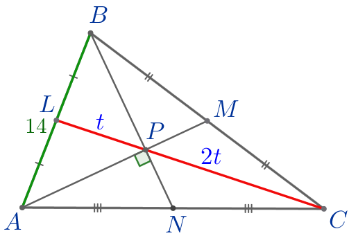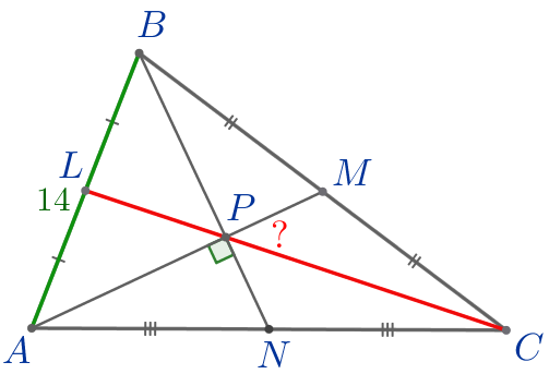В треугольнике \(\displaystyle ABC\) точки \(\displaystyle L{\small,}\) \(\displaystyle M\) и \(\displaystyle N\) являются серединами сторон \(\displaystyle AB{\small,}\) \(\displaystyle BC\) и \(\displaystyle AC\) соответственно. Отрезки \(\displaystyle AM\) и \(\displaystyle BN\) перпендикулярны и пересекаются в точке \(\displaystyle P{\small.}\) Найдите длину \(\displaystyle CL{\small,}\) если \(\displaystyle AB=14{\small.}\)