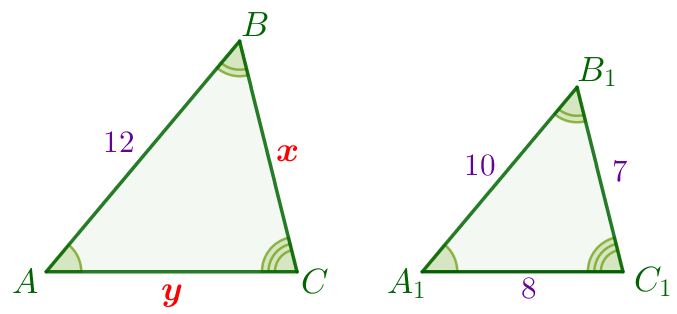 Треугольники \(\displaystyle ABC\) и \(\displaystyle A_1B_1C_1\) подобны: \(\displaystyle \angle A=\angle A_1{\small,}\) \(\displaystyle \angle B=\angle B_1{\small,}\) \(\displaystyle \angle C=\angle C_1{\small.}\)