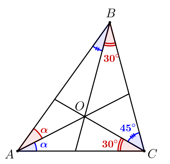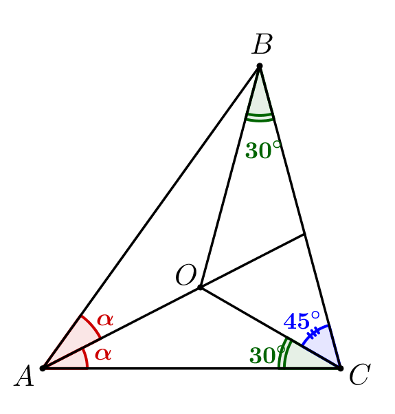 Тогда напишем теорему Чевы в синусах для треугольника \(\displaystyle ABC\) и чевиан \(\displaystyle AO,\,BO\) и \(\displaystyle CO{\small:}\) \(\displaystyle \frac{\sin45^{\circ}}{\sin30^{\circ}}\cdot\frac{\sin\alpha}{\sin\alpha}\cdot\frac{\sin\angle OBA}{\sin30^{\circ}}=1\small.\) Сократим \(\displaystyle \sin\alpha\) и подставим известные значения \(\displaystyle \sin30^{\circ}=\frac{1}{2}\) и \(\displaystyle \sin45^{\circ}=\frac{\sqrt{2}}{2}{\small:}\) \(\displaystyle \frac{\frac{\sqrt{2}}{2}}{\frac{1}{2}}\cdot\frac{\sin\angle OBA}{\frac{1}{2}}=1\small,\) \(\displaystyle \sin\angle OBA=\frac{1}{4}:\frac{\sqrt2}{2}=\frac{\sqrt2}{4}\small.\) | ![]() |