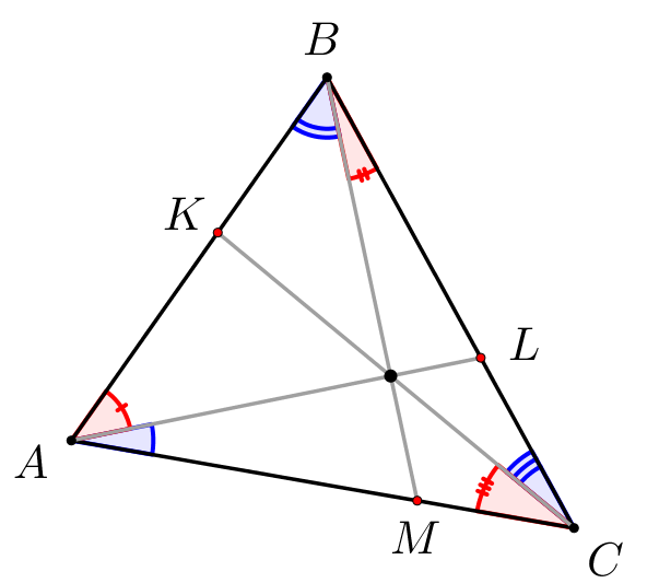 Продлим отрезки \(\displaystyle AO,\,BO\) и \(\displaystyle CO\) до пересечениями со сторонами. Получились три чевианы, пересекающиеся в одной точке. Некоторые из углов, на которые чевианы делят углы треугольника, нам известны.
