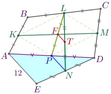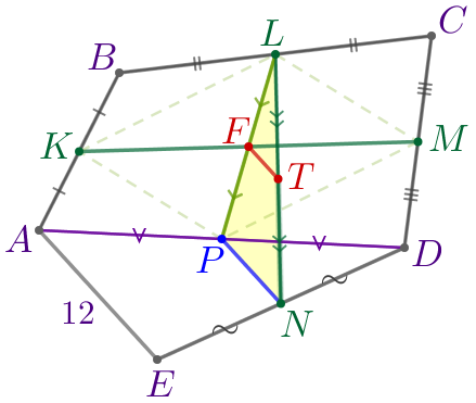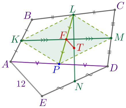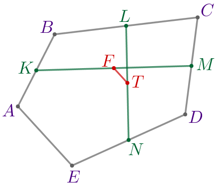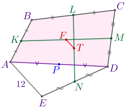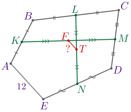 Точки \(\displaystyle K{\small,}\) \(\displaystyle L{\small,}\) \(\displaystyle M{\small,}\) \(\displaystyle N\) – середины сторон \(\displaystyle AB{\small,}\) \(\displaystyle BC{\small,}\) \(\displaystyle CD\) и \(\displaystyle DE\) выпуклого пятиугольника \(\displaystyle ABCDE\) соответственно. Точки \(\displaystyle F\) и \(\displaystyle T\) – середины отрезков \(\displaystyle KM\) и \(\displaystyle LN\) соответственно. Найдите длину отрезка \(\displaystyle FT{\small,}\) если \(\displaystyle AE=12{\small.}\)
