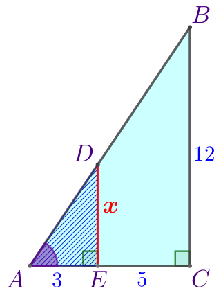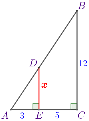 Подставим \(\displaystyle DE=\color{red}{x}{\small,}\) \(\displaystyle BC=12{\small,}\) \(\displaystyle AE=3{\small,}\) \(\displaystyle AC=8{\small:}\)