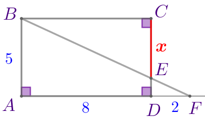 Подставим \(\displaystyle CE=\color{red}{x}{\small,}\) \(\displaystyle AB=5{\small,}\) \(\displaystyle BC=8{\small,}\) \(\displaystyle AF=10{\small:}\)