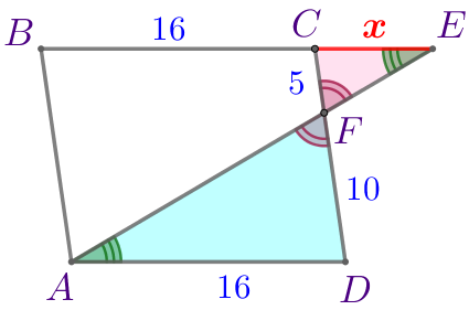 Подставим \(\displaystyle CЕ=\color{red}{x}{\small,}\) \(\displaystyle AD=16{\small,}\) \(\displaystyle CF=5{\small,}\) \(\displaystyle DF=10{\small:}\)