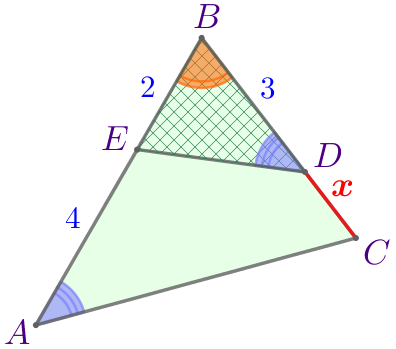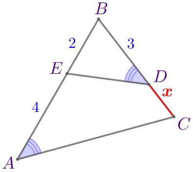 Подставим \(\displaystyle BC=3+\color{red}{x}{\small,}\) \(\displaystyle BE=2{\small,}\) \(\displaystyle AB=6{\small,}\) \(\displaystyle BD=3{\small:}\)