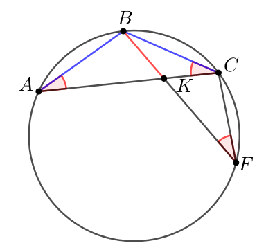 Обозначим точки и отметим равные углы. Так как треугольник \(\displaystyle ABC\) равнобедренный, то \(\displaystyle \angle BAC=\angle BCA\small.\) Углы \(\displaystyle \angle BAC\) и \(\displaystyle \angle BFC\) опираются на одну дугу окружности. Значит, они равны. Тогда треугольники \(\displaystyle CBK\) и \(\displaystyle FBC\) подобны: