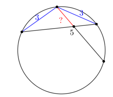 В окружность вписан равнобедренный треугольник, боковые стороны которого равны \(\displaystyle 3\small.\) Через его вершину провели хорду окружности длины \(\displaystyle 5\small,\) которая пересекает основание треугольника. Найдите длину отрезка этой хорды, лежащего внутри данного треугольника.