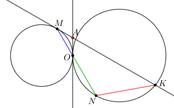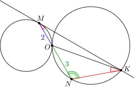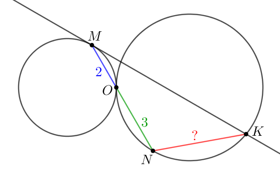 Две окружности касаются внешним образом в точке \(\displaystyle O\small.\) Прямая касается первой окружности в точке \(\displaystyle M\) и пересекает вторую в точке \(\displaystyle K\) (как показано на рисунке). Прямая \(\displaystyle MO\) пересекает вторую окружность в точке \(\displaystyle N\small.\) Найдите отрезок \(\displaystyle KN\small,\) если \(\displaystyle MO = 2\small,\) а \(\displaystyle NO = 3\small.\)