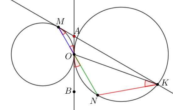 Угол между касательной и хордой \(\displaystyle NOB\) равен углу \(\displaystyle OKN\small,\) опирающемуся на эту хорду.
