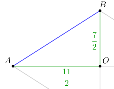 В прямоугольном треугольнике \(\displaystyle ABO\) известны катеты \(\displaystyle AO=\frac{11}{2}\) и \(\displaystyle BO=\frac{7}{2}\small.\)
