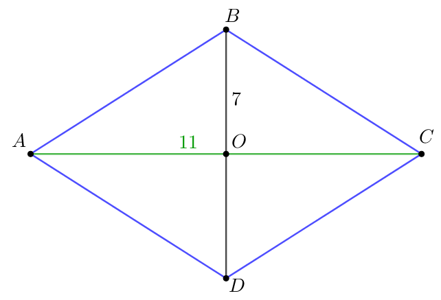 Диагонали ромба равны \(\displaystyle 7\) и \(\displaystyle 11\small.\) Найдите сторону этого ромба.