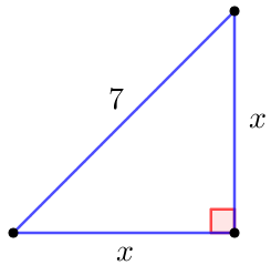 То есть \(\displaystyle x^2+x^2=7^2\small.\) Откуда находим \(\displaystyle x{\small:}\) \(\displaystyle 2x^2=49\small;\) \(\displaystyle x^2=\frac{49}{2} {\small;}\) \(\displaystyle x=\sqrt{\frac{49}{2}}=\frac{7\sqrt{2}}{2}\small.\) |