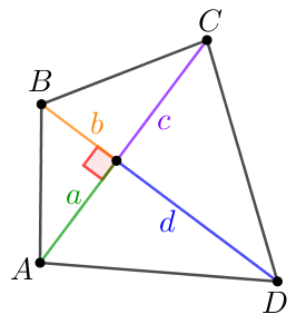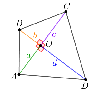 В четырехугольнике \(\displaystyle ABCD\) диагонали перпендикулярны. Точка пересечения диагоналей делит их на части \(\displaystyle a,\,b,\,c,\,d\) (как показано на рисунке).