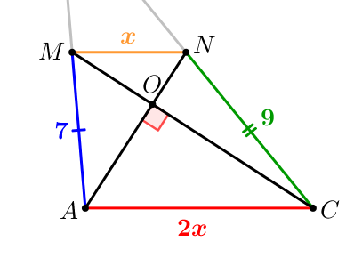 Рассмотрим четырехугольник \(\displaystyle MNCA\small:\) \(\displaystyle \color{red}{1)}\) сторона \(\displaystyle MN\) является средней линией треугольника \(\displaystyle ABC\small.\) Следовательно, \(\displaystyle MN=\frac{AC}{2}\small.\) Обозначим \(\displaystyle MN=x\small,\) тогда \(\displaystyle AC=2x\small.\) | ![]() |
