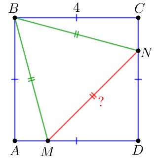 Вершины \(\displaystyle M\) и \(\displaystyle N\) равностороннего треугольника \(\displaystyle BMN\) лежат соответственно на сторонах \(\displaystyle AD\) и \(\displaystyle CD\) квадрата \(\displaystyle ABCD\) со стороной \(\displaystyle 4\small.\) Найдите \(\displaystyle MN\small.\)