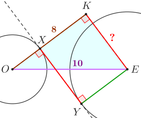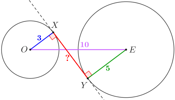Обозначим центры окружностей буквами \(\displaystyle O\) и \(\displaystyle E{\small,}\) а точки касания общей касательной с окружностями буквами \(\displaystyle X\) и \(\displaystyle Y\) соответственно.